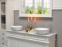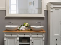 Dieses Landhaus Badmöbel-Set besteht aus einer Waschtisch-Kommode mit Aufsatzbecken und einem dazu passenden Spiegel. Das Sortiment an Badmöbel im Landhausstil reicht von Hängeschränken über Badhocker und Kommoden. Platzieren Sie eine mit kunstvoll geschwungenen Füßen versehene Badewanne frei im Raum verstärkt sich das Gefühl von Losgelöstheit und Wohlbehagen.