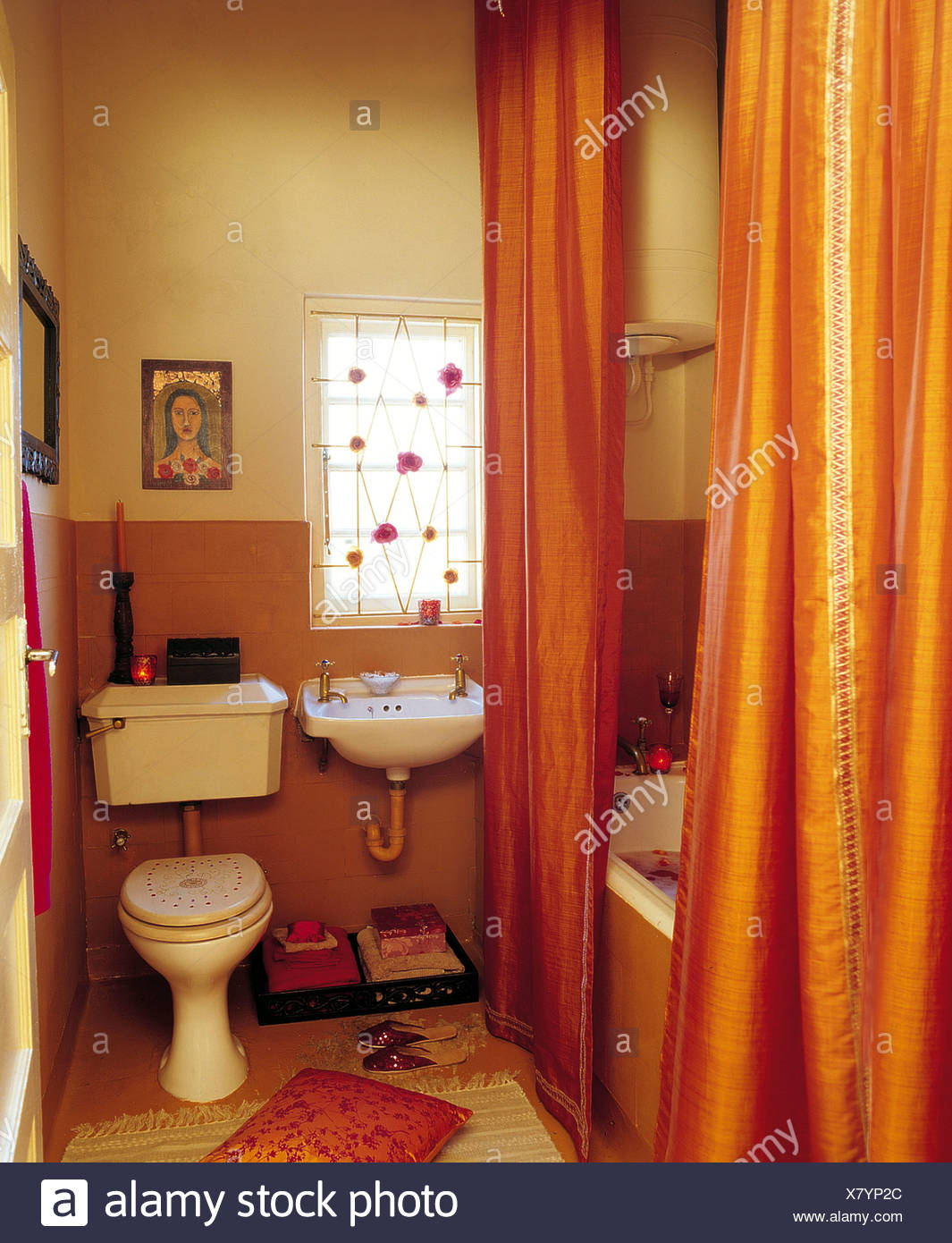 Real Hauser Forpeaceful Oase Badezimmer Makeover Kleine Terrakottafliesen Im Bad Auf Halbem Weg Oben Beige Wand Orange Flowith Ein Stockfotografie Alamy