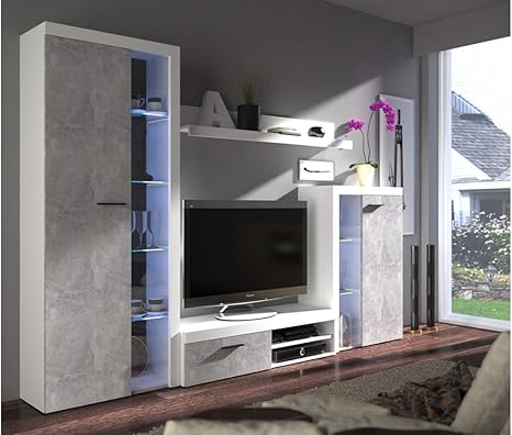 Kryspol Wohnwand Bono Anbauwand Wohnzimmer Set Modern Design Beton Weiss Mit Blauer Led Beleuchtung Amazon De Kuche Haushalt