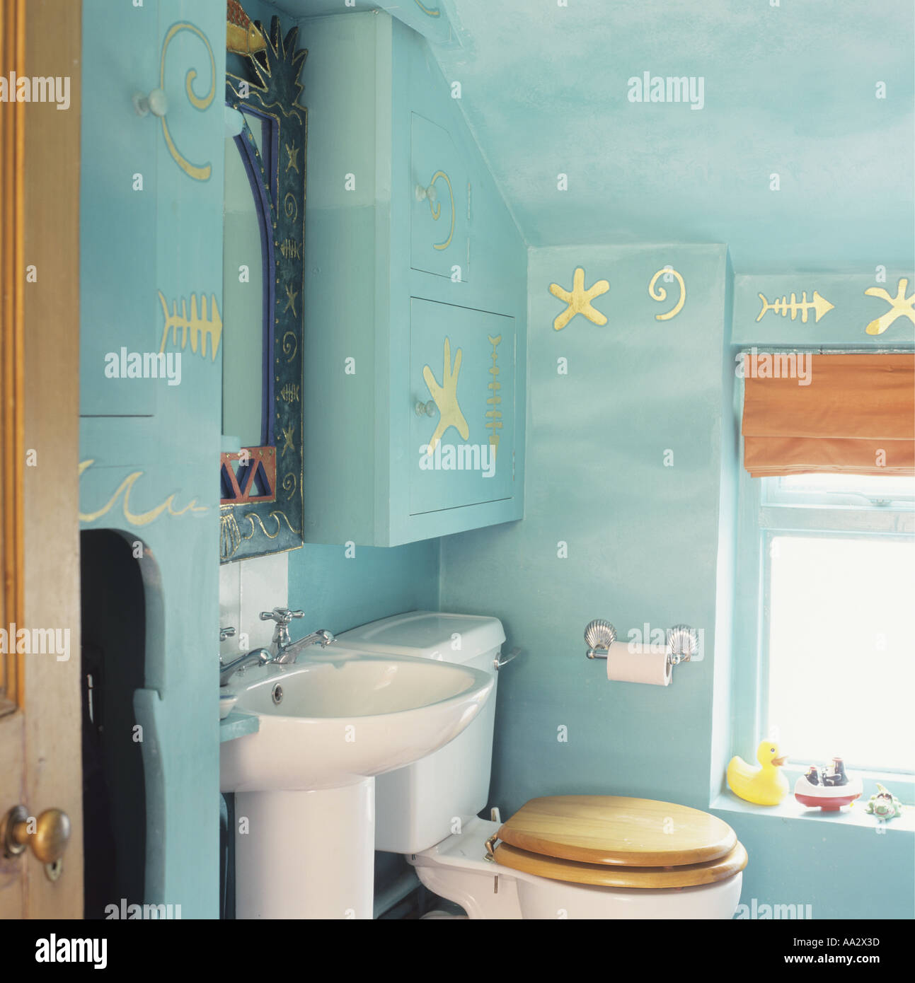 Weissen Sockel Becken Neben Toilette Mit Holzsitz In Kleinen Turkisfarbenen Badezimmer Mit Seestern Und Meereskuste Verzierungen An Wanden Stockfotografie Alamy