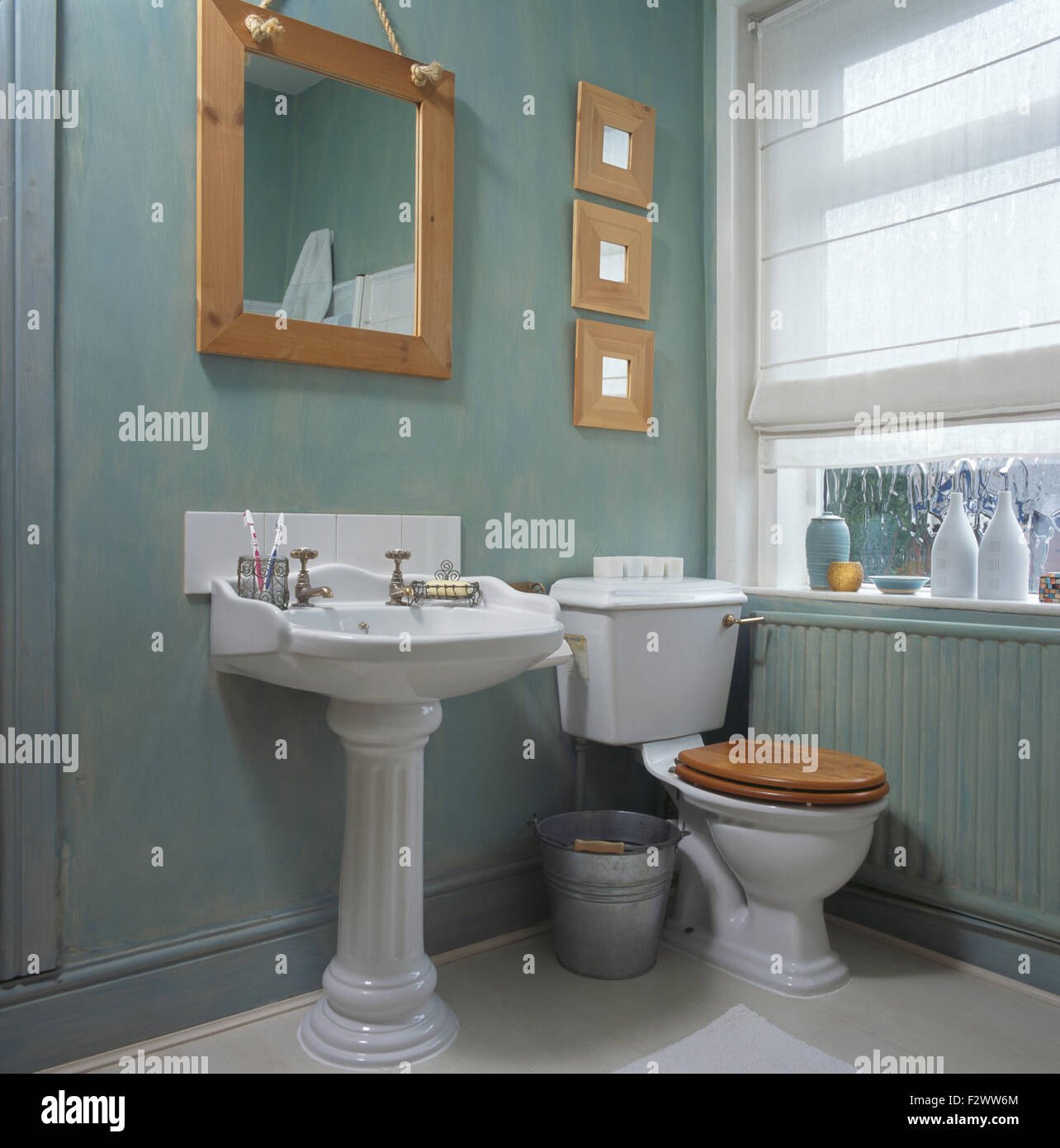 Holz Spiegel Uber Sockel Becken In Blassen Turkis Bad Mit Weissen Blind Auf Das Fenster Stockfotografie Alamy