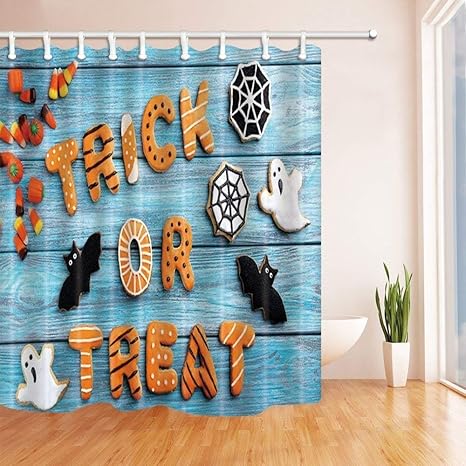 Cdhbh Halloween Decor Trick Oder Behandeln Und Ghost Fledermause Auf Turkis Holz Polyester Duschvorhange Wasserdicht Badezimmer Vorhang Fur Dusche Badewanne Haken Enthalten 180x180cm Amazon De Kuche Haushalt